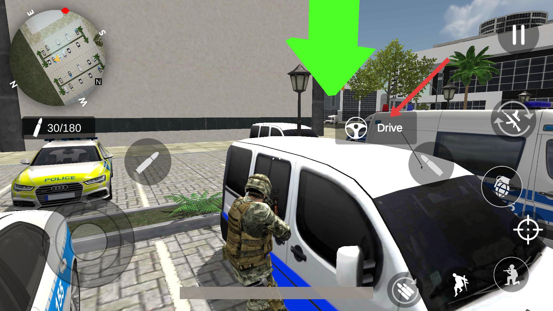 2、進(jìn)入游戲場(chǎng)景后,操控角色在停車場(chǎng)區(qū)域移動(dòng),注意周圍的警車,利用場(chǎng)景中的車輛作為掩護(hù),準(zhǔn)備執(zhí)行后續(xù)任務(wù)。