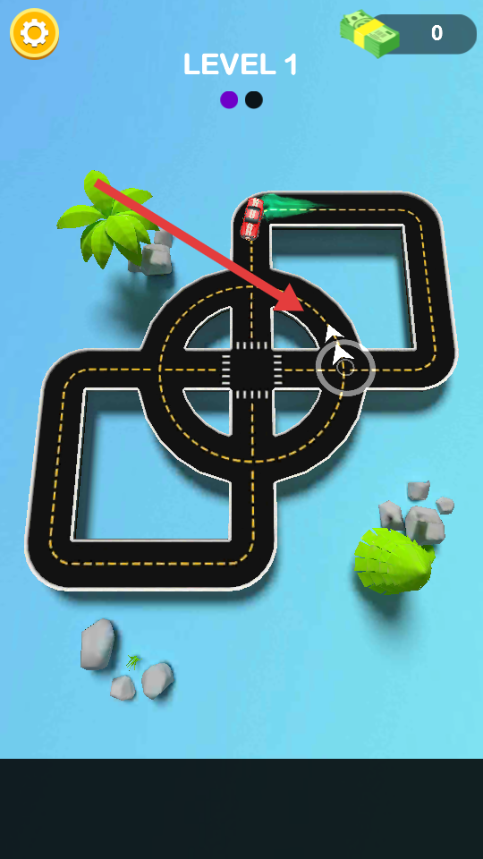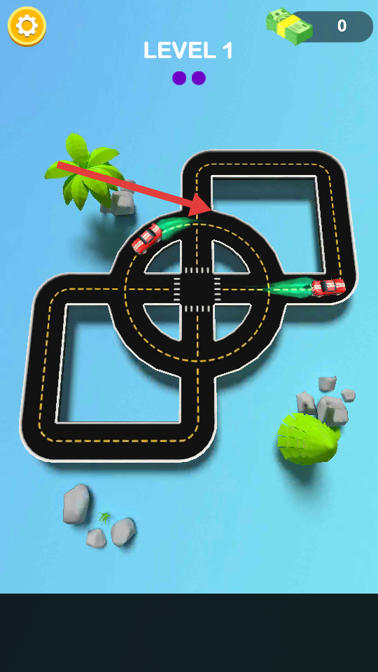 2、進入游戲后通過點擊并拖動屏幕上的箭頭標識,規(guī)劃汽車在復(fù)雜環(huán)形賽道上的行駛路線,讓汽車能夠順利通過各個路口和彎道。