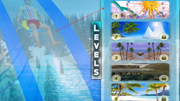 2、在關(guān)卡選擇界面,可挑選不同的關(guān)卡,每個關(guān)卡都有獨特的水上滑梯場景和難度設(shè)置,從簡單的游樂園場景到更具挑戰(zhàn)性的自然場景等。