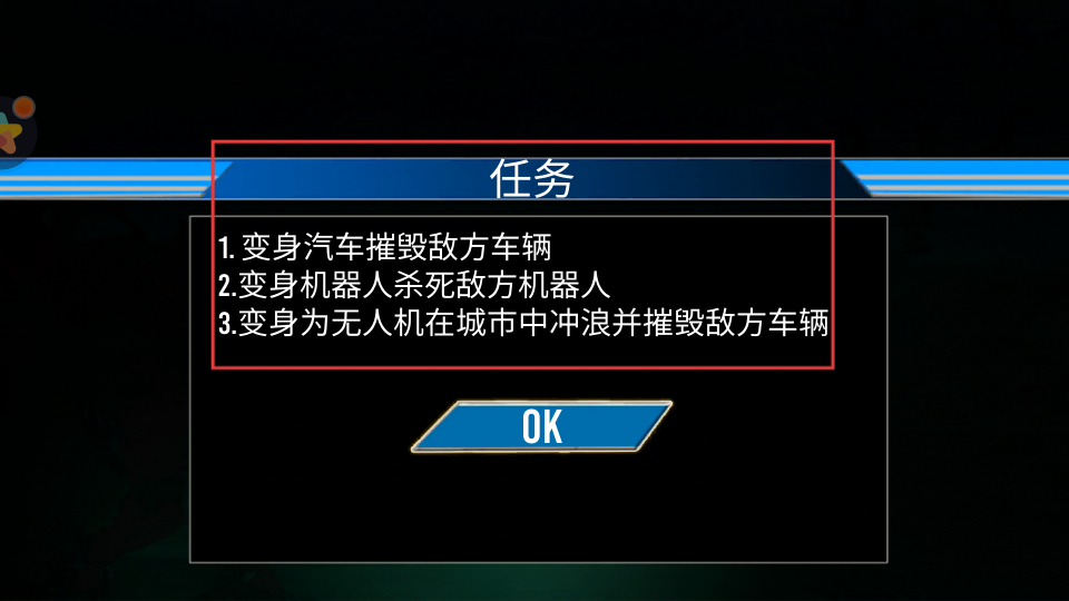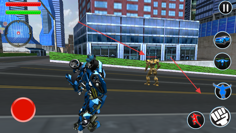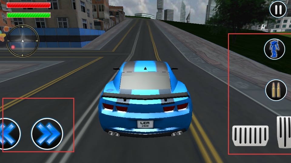 3、根據(jù)任務(wù)要求,可通過相應(yīng)按鈕將機(jī)器人變身為汽車、無人機(jī)等形態(tài),利用左右方向按鈕和加速剎車按鈕,在城市道路上行駛并摧毀敵方車輛。