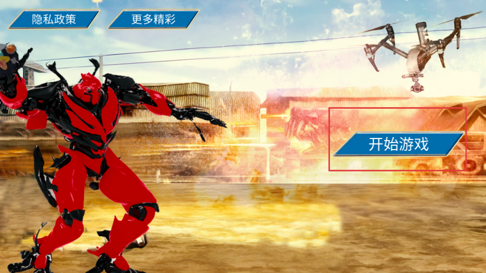 1、玩家下載游戲之后然后點(diǎn)擊進(jìn)入在游戲主界面,點(diǎn)擊開始游戲按鈕,進(jìn)入游戲場景,開啟機(jī)器人英雄大戰(zhàn)的冒險。