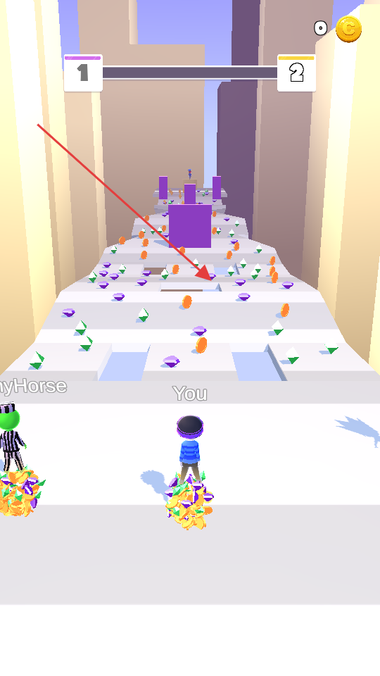 2、游戲開(kāi)始后操控角色在賽道上前進(jìn),收集散落在賽道上的各種寶石和金幣,收集的寶石和金幣數(shù)量會(huì)影響最終的游戲成績(jī)。