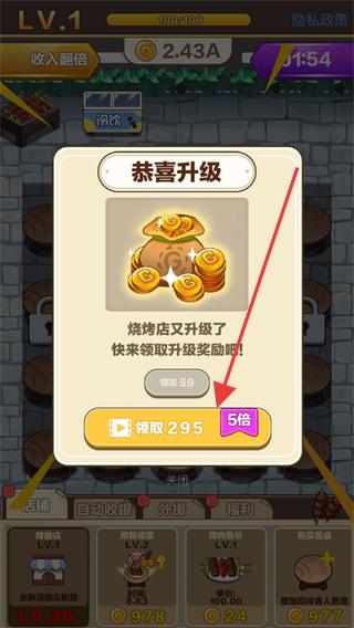 4、當(dāng)燒烤店成功升級后,會彈出恭喜升級的提示框,此時可點(diǎn)擊領(lǐng)取按鈕,獲取升級獎勵,讓燒烤店經(jīng)營更上一層樓。
