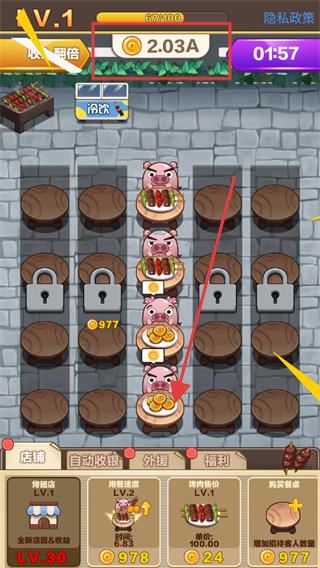 3、持續(xù)通過滑動收取金幣和利用用豬賺錢功能,積累足夠的金幣后,燒烤店會自動升級,升級過程中金幣數(shù)量會不斷增長。