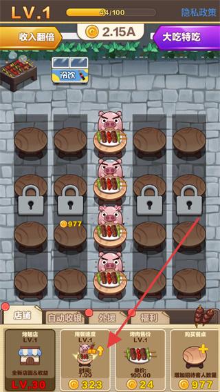 2、在燒烤店界面下方找到用豬賺錢相關(guān)的按鈕,點(diǎn)擊該按鈕,可讓小豬為燒烤店帶來更多收益,增加金幣獲取速度。