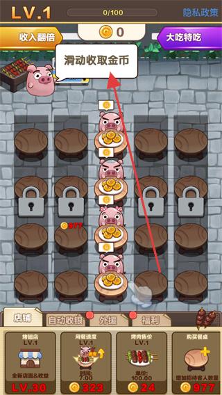 1、進(jìn)入游戲看到有小豬和餐桌的燒烤店場景,根據(jù)提示滑動屏幕,收取餐桌上的金幣,積累初始的金幣資源。