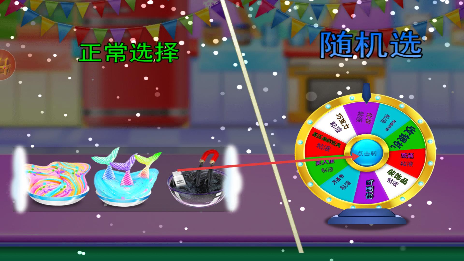 1、進(jìn)入游戲在選擇界面可根據(jù)需求,選擇正常選擇或隨機(jī)選,若選隨機(jī)選點(diǎn)擊轉(zhuǎn)盤中間的點(diǎn)擊轉(zhuǎn)按鈕,讓轉(zhuǎn)盤轉(zhuǎn)動(dòng)隨機(jī)獲取粘液制作相關(guān)物品。