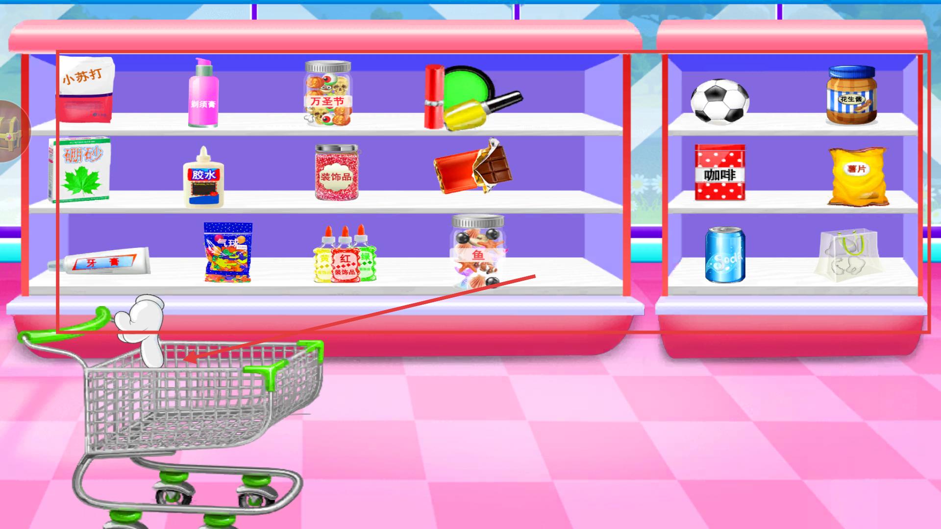 3、進(jìn)入商店場(chǎng)景看到貨架上擺放著各種物品,在貨架間移動(dòng)挑選需要的粘液制作材料,將其放入購(gòu)物車。