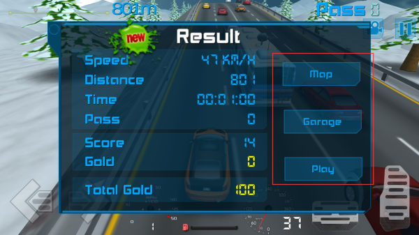 4、結(jié)束一局游戲后,在結(jié)果界面查看自己的行駛速度、距離、時(shí)間等數(shù)據(jù),玩家即可點(diǎn)擊Play重新開始游戲。