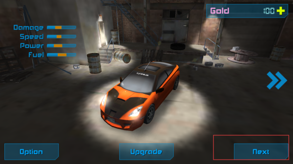 1、玩家下載游戲之后,然后在初始界面中查看汽車的各項(xiàng)屬性,點(diǎn)擊next按鈕開始游戲。