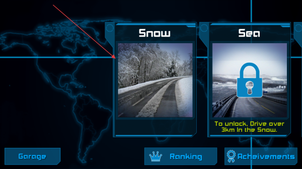 2、玩家進(jìn)入之后選擇自己想要挑戰(zhàn)的地圖關(guān)卡,比如Snow地圖進(jìn)入游戲,即可開啟你的駕駛之路。