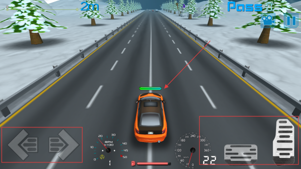 3、在游戲過程使用屏幕左下角的方向鍵控制賽車轉(zhuǎn)向,通過屏幕右下角的油門和剎車踏板來控制賽車的速度和啟停。