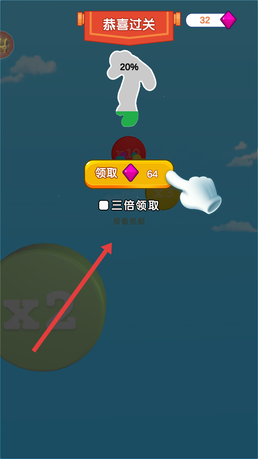 4、玩家完成關(guān)卡挑戰(zhàn),然后過關(guān)后點(diǎn)擊領(lǐng)取按鈕可獲取相應(yīng)數(shù)量的鉆石獎(jiǎng)勵(lì),能選擇觀看視頻來三倍領(lǐng)取獎(jiǎng)勵(lì)。