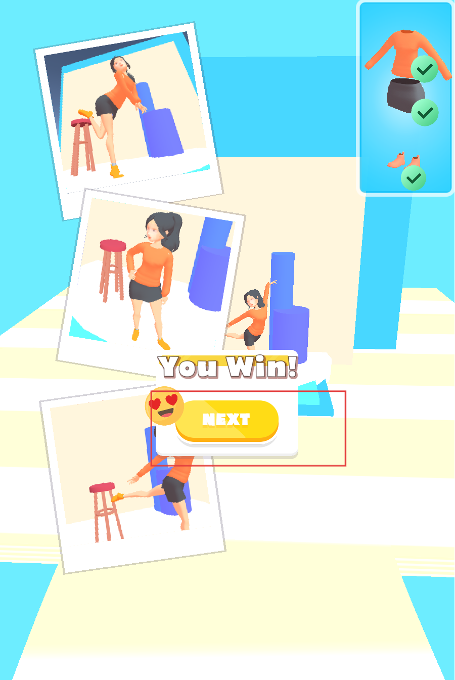 4、成功收集到目標(biāo)服飾完成造型后,游戲會(huì)顯示You Win此時(shí)點(diǎn)擊NEXT按鈕,即可進(jìn)入下一個(gè)關(guān)卡,挑戰(zhàn)新的造型和賽道。