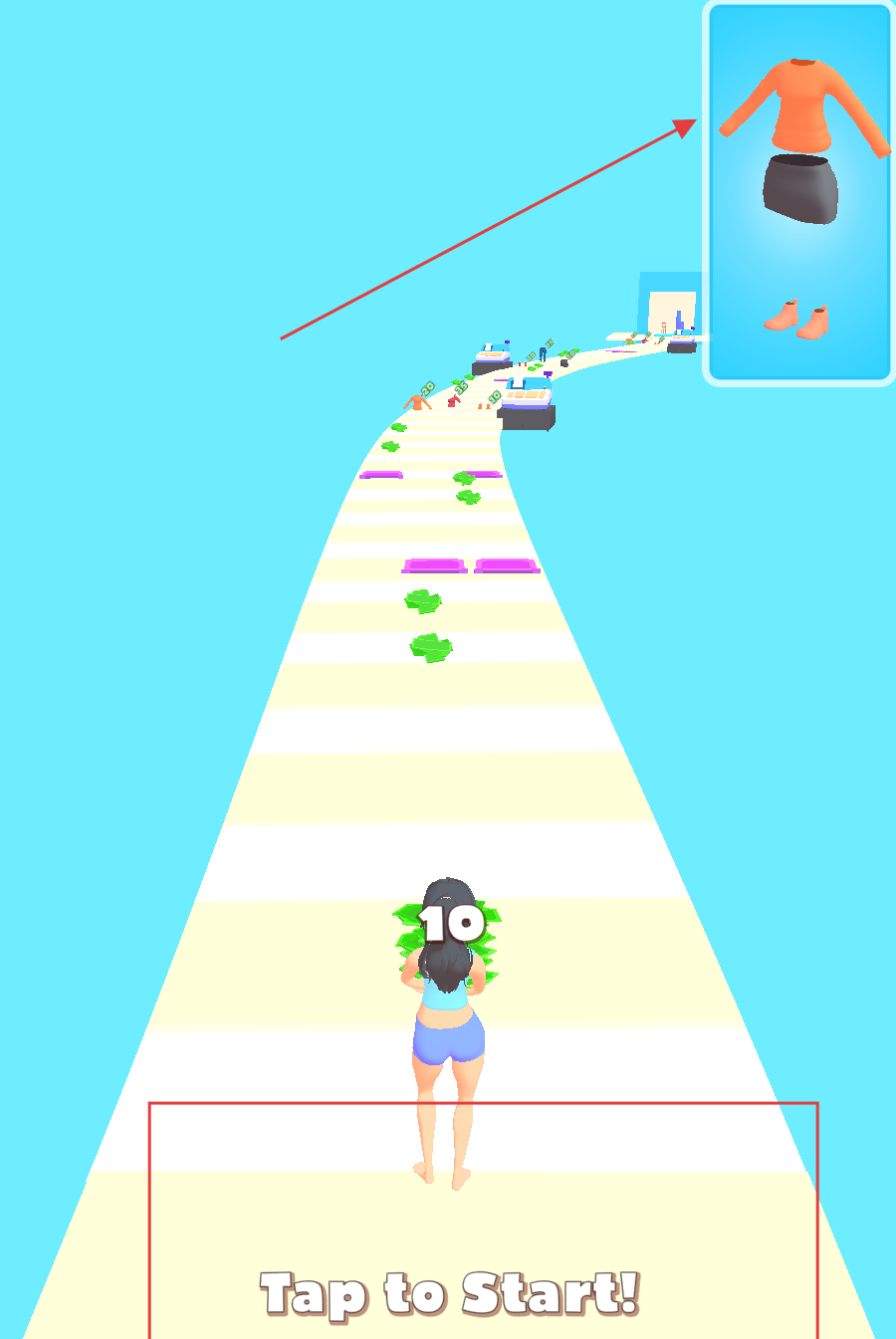 1、玩家下載游戲之后,在游戲主界面點(diǎn)擊Tap to Start區(qū)域,即可開啟購(gòu)物跑酷之旅,操控角色在賽道上前進(jìn)。