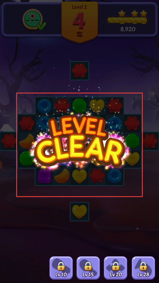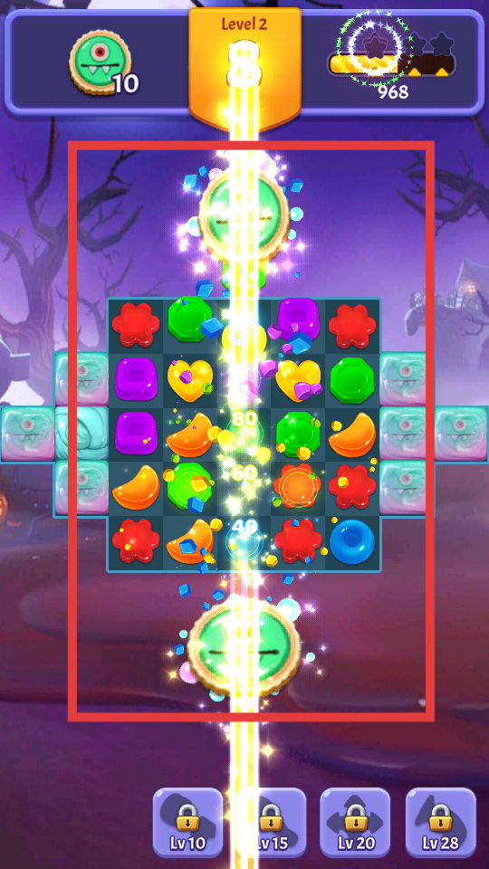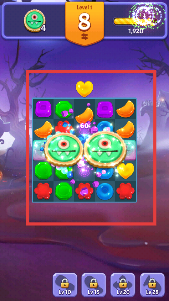 2、持續(xù)匹配方塊,當積累到一定程度,會出現(xiàn)怪物餅干相關的特效,還能獲得分數(shù),要盡量多匹配方塊,爭取獲得更高分數(shù),助力關卡通關。