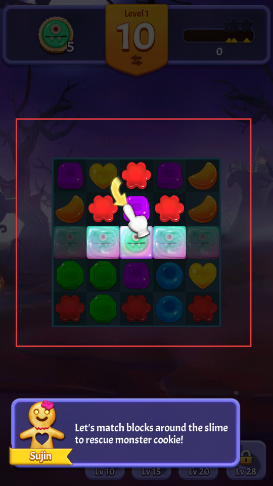 1、進入游戲后,在方塊網(wǎng)格中移動帶有史萊姆的方塊周圍的方塊,進行匹配,以此來救援怪物餅干,每成功匹配一次能推進關卡進度。