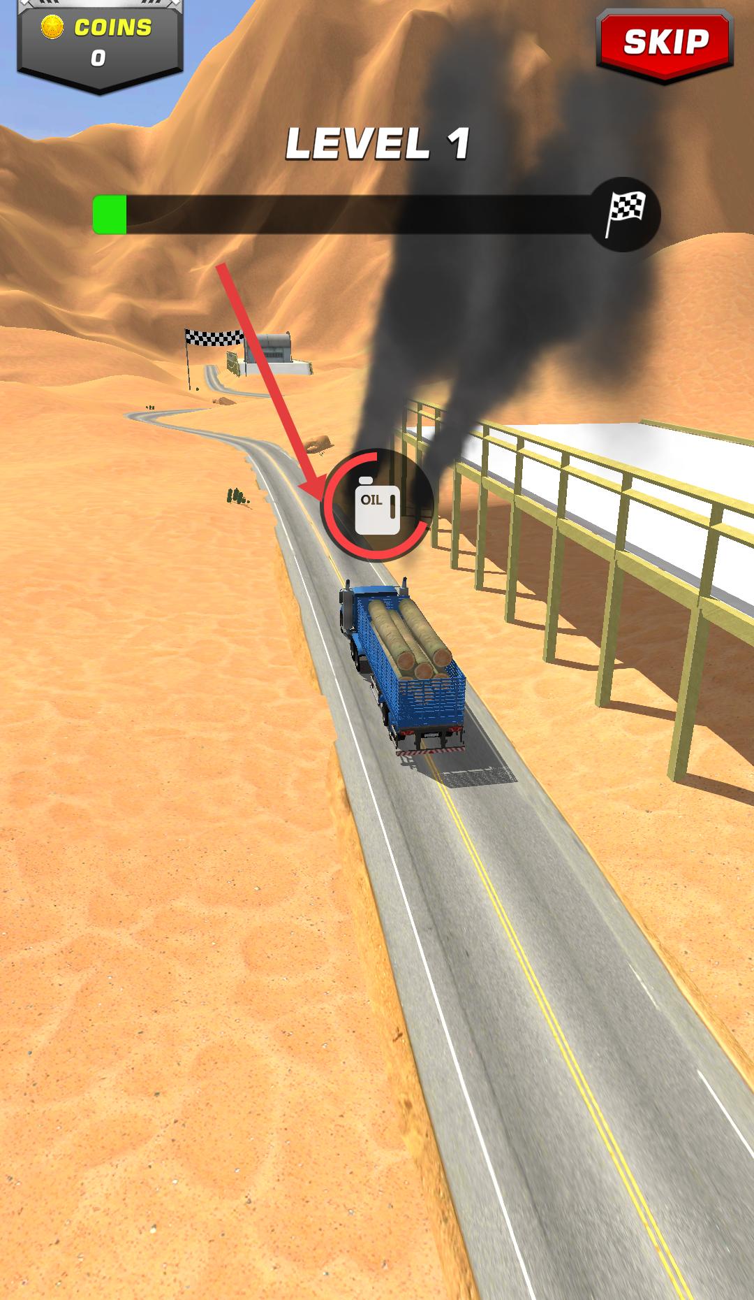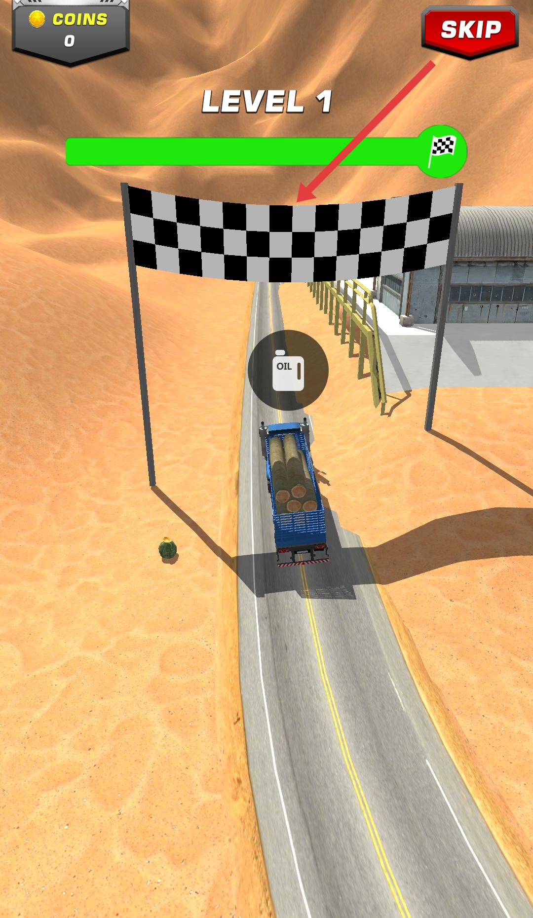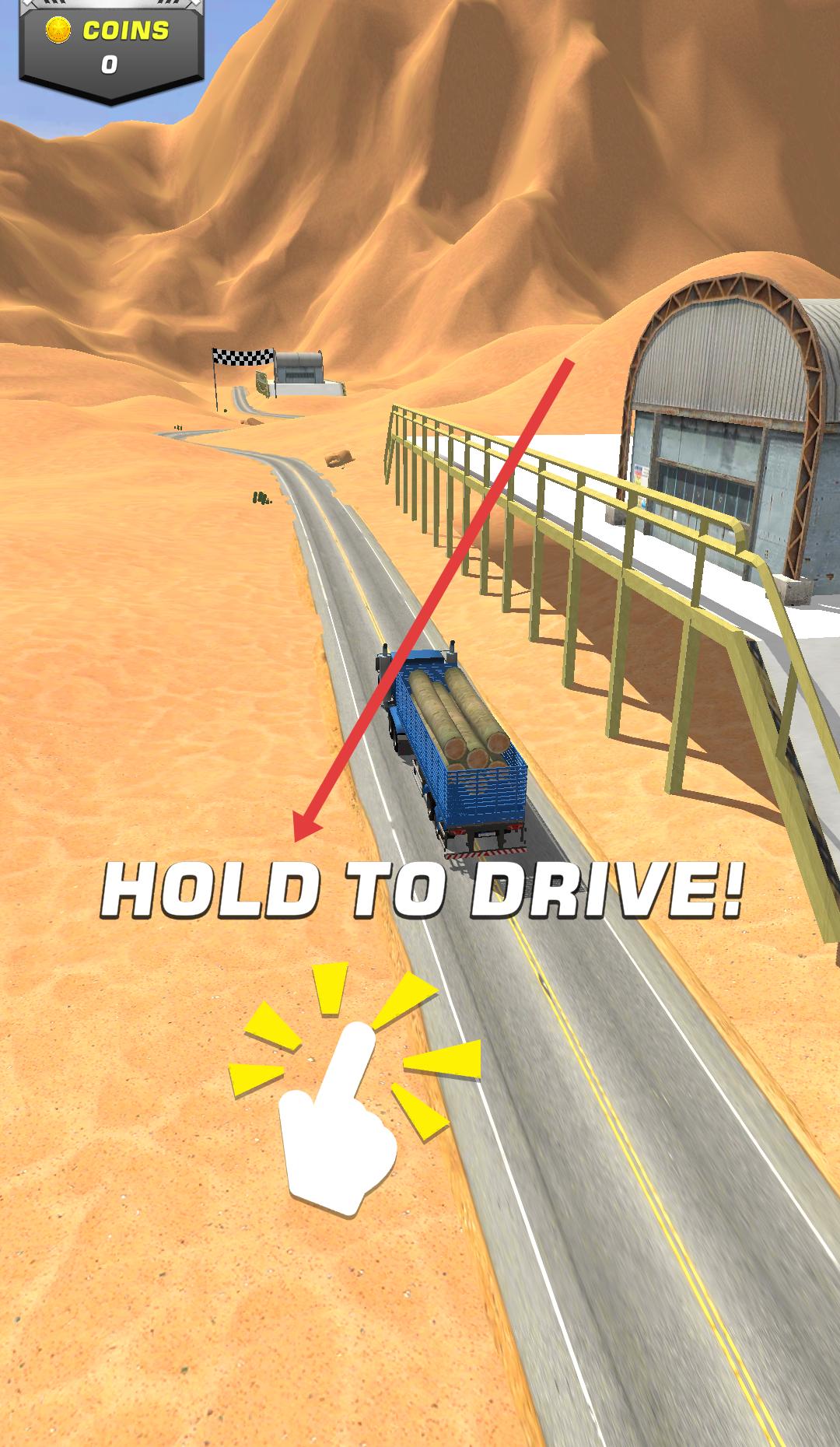 1、進入游戲后按照提示長按屏幕,操控載有貨物的卡車在沙漠道路上行駛,要注意保持行駛方向,避免卡車偏離道路。