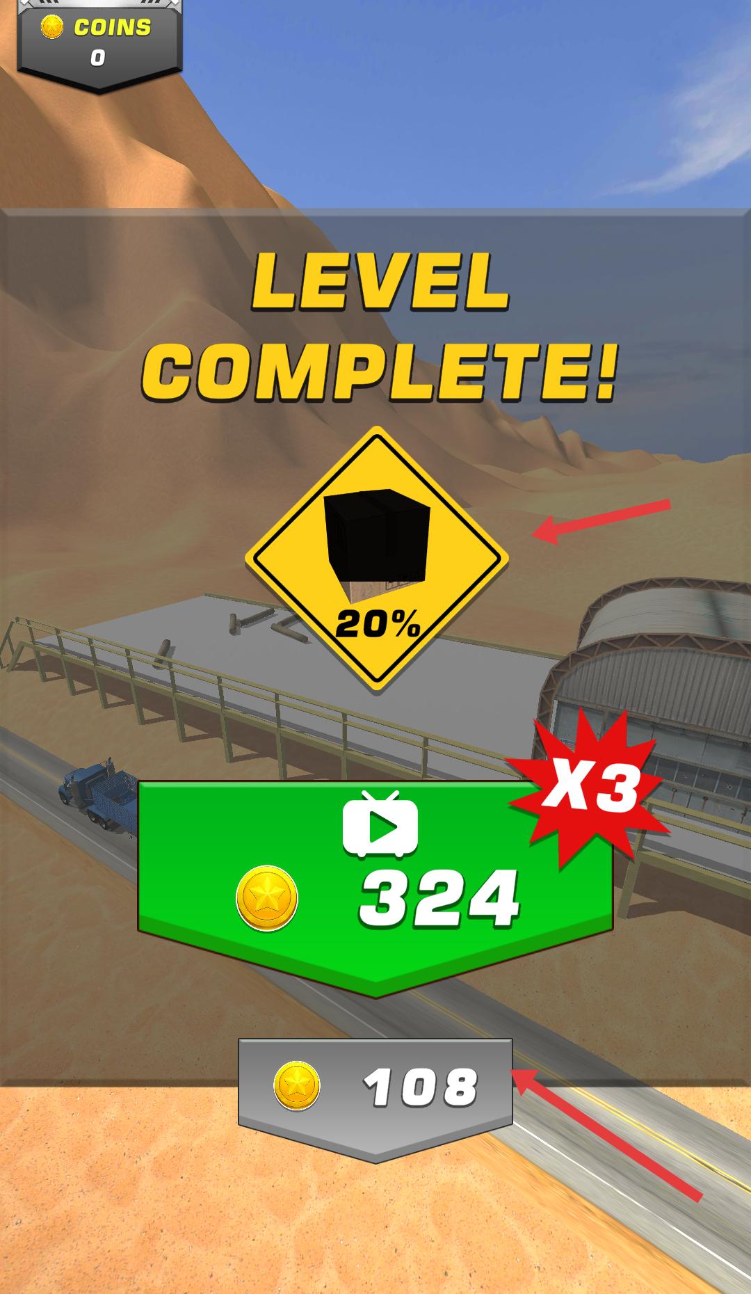 4、成功通過終點后,會顯示關(guān)卡完成的界面,此時可以選擇獲取相應(yīng)的金幣獎勵,這些金幣可用于后續(xù)解鎖新的卡車或其他游戲內(nèi)容。