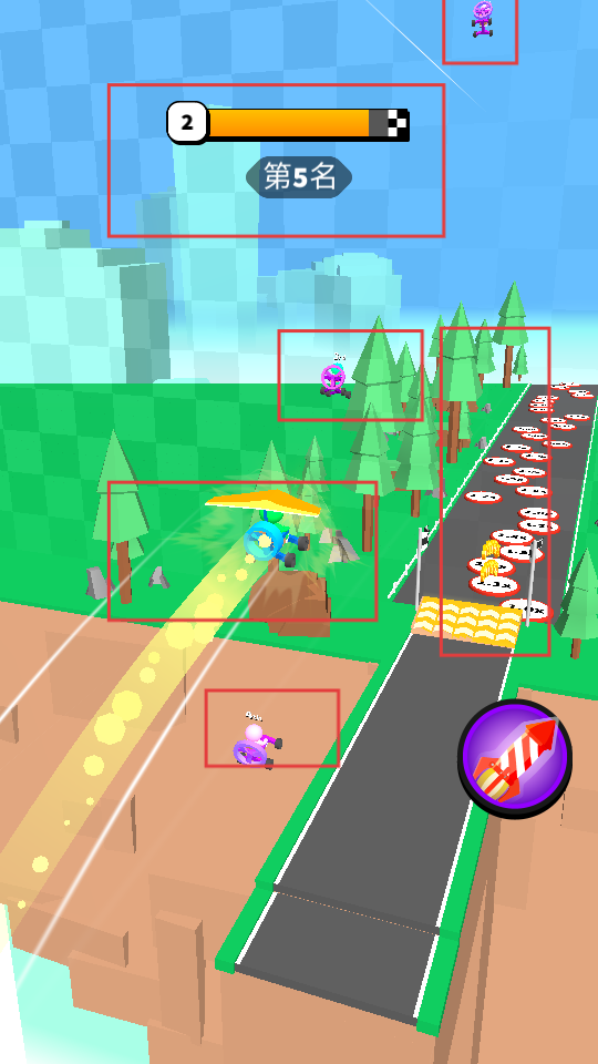 2、在賽道上,操控角色前進(jìn),躲避障礙,超越其他對(duì)手,遇到特殊道具,可點(diǎn)擊使用,助力自己在比賽中取得好名次。