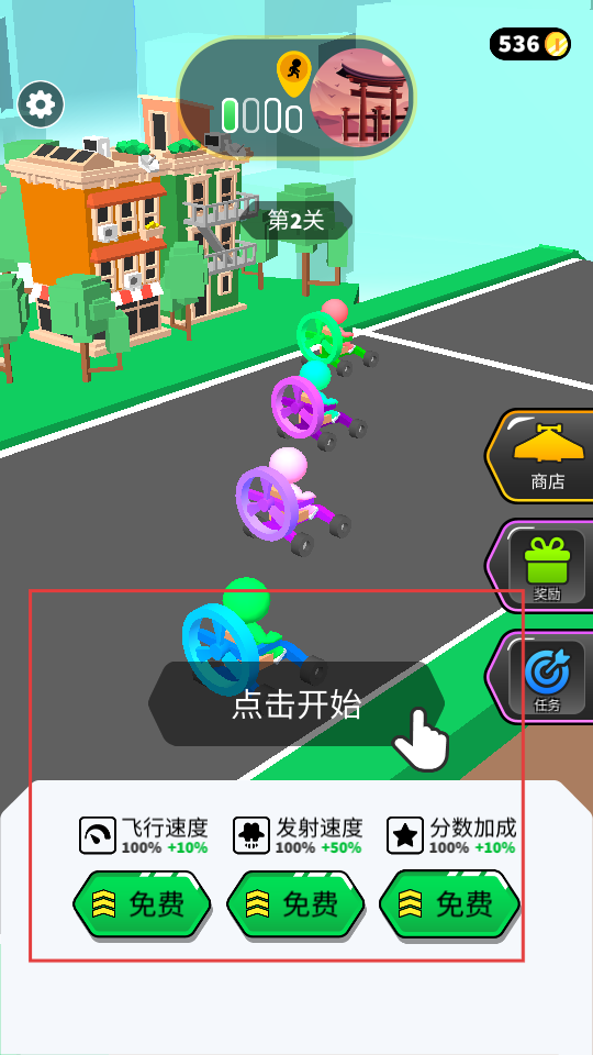 1、點(diǎn)擊開(kāi)始,進(jìn)入游戲關(guān)卡,可在商店、獎(jiǎng)勵(lì)、任務(wù)界面,查看和獲取道具、獎(jiǎng)勵(lì),還能提升飛行速度、發(fā)射速度等屬性。
