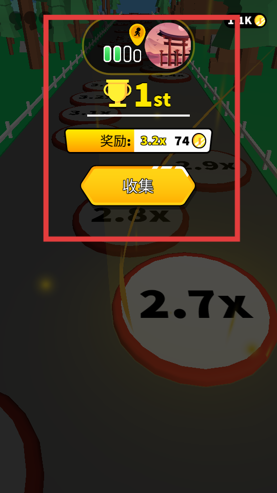 4、成功獲得第一名后,會(huì)顯示獎(jiǎng)勵(lì),點(diǎn)擊收集按鈕,領(lǐng)取倍數(shù)加成和金幣獎(jiǎng)勵(lì),之后可繼續(xù)挑戰(zhàn)其他關(guān)卡,爭(zhēng)取更好成績(jī)。
