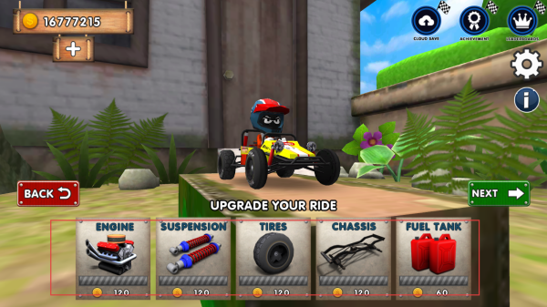 4、使用在游戲中收集到的金幣,在升級界面UPGRADE YOUR RIDE對賽車的部件進行升級,提升賽車性能以應對更具挑戰(zhàn)性的賽道。