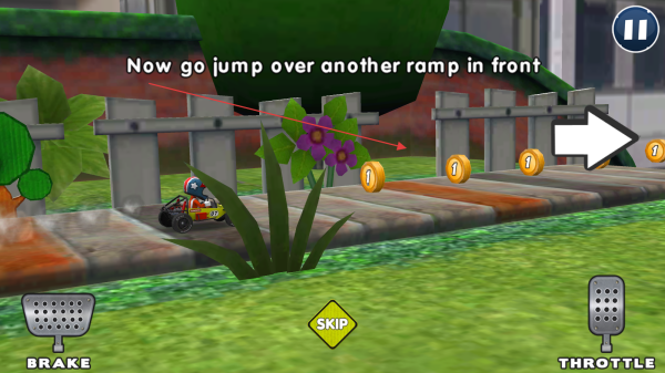 3、在行駛過程中留意賽道上的金幣,操控賽車收集它們,遇到前方的坡道時,把握好油門時機,讓賽車順利跳躍通過坡道通關成功。