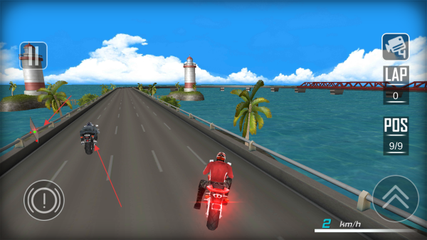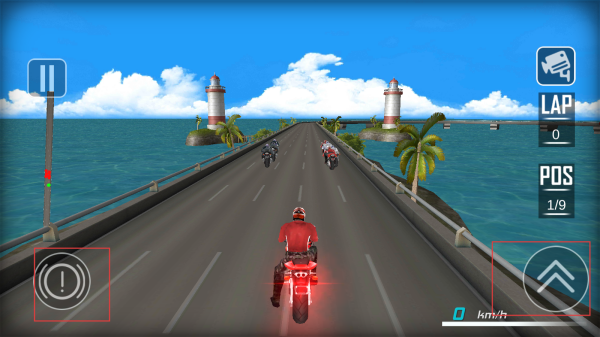 3、在比賽過程中利用屏幕右側(cè)的加速按鈕提升摩托車速度,通過屏幕左側(cè)的方向控制按鈕調(diào)整摩托車的行駛方向,超越其他對(duì)手。