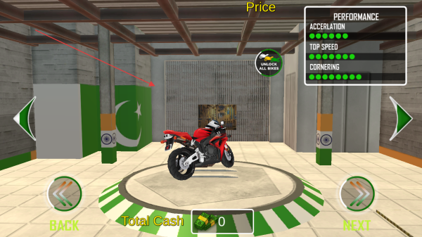 2、進(jìn)入車庫界面后,查看不同摩托車的性能了解車輛情況,點(diǎn)擊NEXT按鈕可查看更多摩托車,選擇心儀的摩托車準(zhǔn)備參賽。