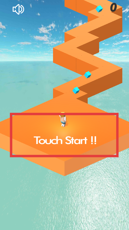 1、點(diǎn)擊Touch Start,操控角色在橙色的曲折路徑上前進(jìn),前進(jìn)時(shí)收集藍(lán)色的方塊,每收集到一個(gè),上方的分?jǐn)?shù)就會(huì)增加,不斷積累分?jǐn)?shù)。