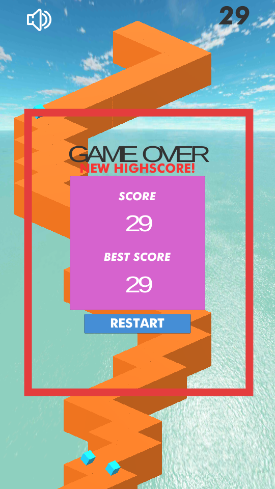 4、若角色掉落路徑,游戲結(jié)束,會(huì)顯示分?jǐn)?shù)和最佳分?jǐn)?shù),此時(shí)可點(diǎn)擊RESTART按鈕重新開(kāi)始游戲,繼續(xù)挑戰(zhàn),爭(zhēng)取突破之前的最佳分?jǐn)?shù)。