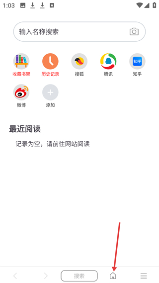 1、點(diǎn)擊首頁(yè)設(shè)搜索功能,集成收藏書(shū)架、訪問(wèn)歷史等模塊,可添加應(yīng)用,最近閱讀暫無(wú)記錄,提示前往網(wǎng)站閱讀。