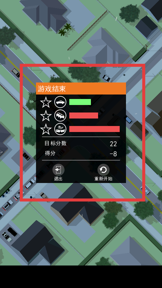 3、若車輛發(fā)生碰撞,游戲結(jié)束,會顯示得分等信息,可選擇退出或重新開始,再次挑戰(zhàn)路口交通控制。