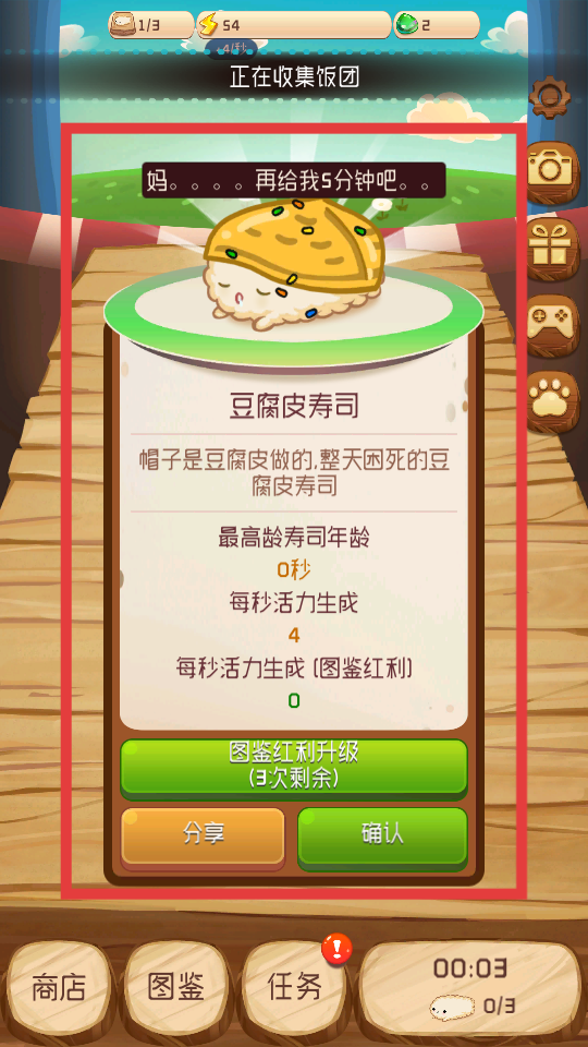 2、通過操作收集飯團,積累到一定數(shù)量后,可合成出豆腐皮壽司等美食,合成后會顯示美食的相關(guān)信息。