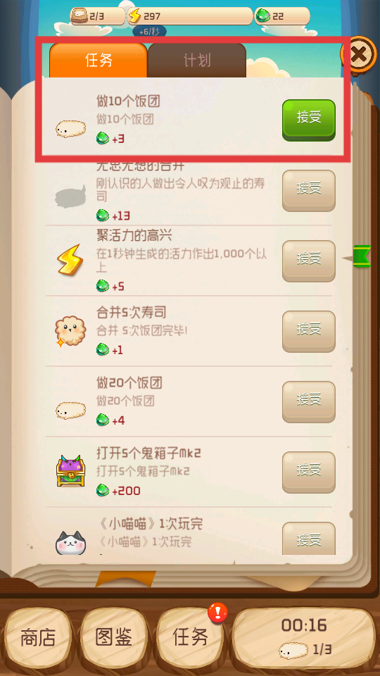 3、查看任務(wù)列表,選擇并接受任務(wù),如制作指定數(shù)量的飯團,完成任務(wù)后可獲得獎勵,推進游戲進程。