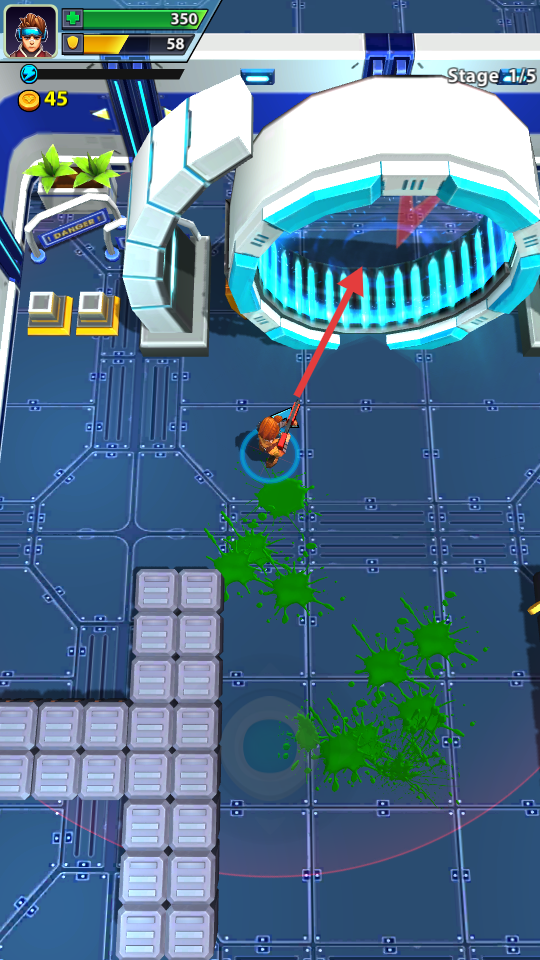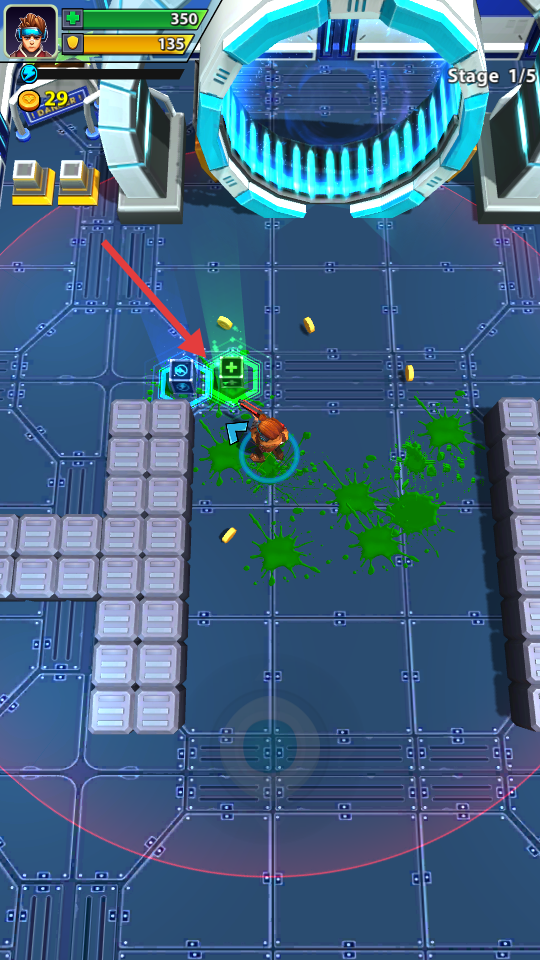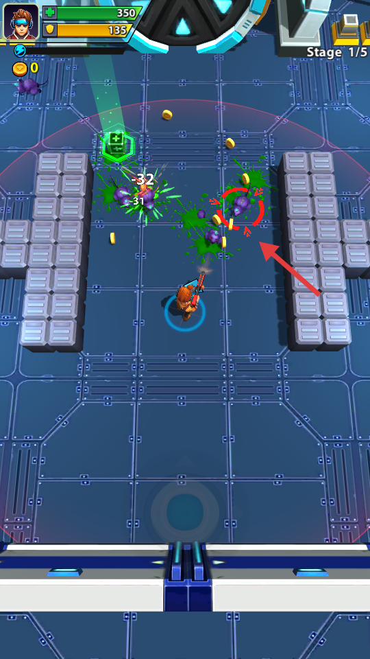 2、操控角色瞄準(zhǔn)敵人,角色會(huì)自動(dòng)借助武器發(fā)起攻擊以造成傷害,擊敗敵人后會(huì)掉落金幣,同時(shí)場(chǎng)景中存在綠色補(bǔ)給道具,讓角色能持續(xù)投入戰(zhàn)斗。
