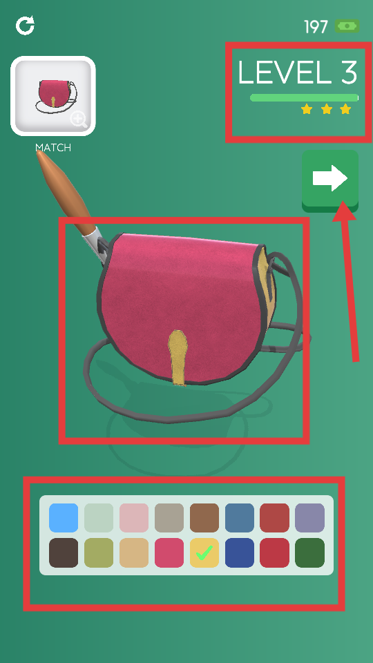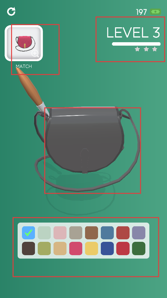 1、進(jìn)入關(guān)卡,查看左側(cè)MATCH里的目標(biāo)物品樣式,從下方調(diào)色板選對應(yīng)顏色,然后用畫筆給灰色物品上色,開始還原目標(biāo)物品。