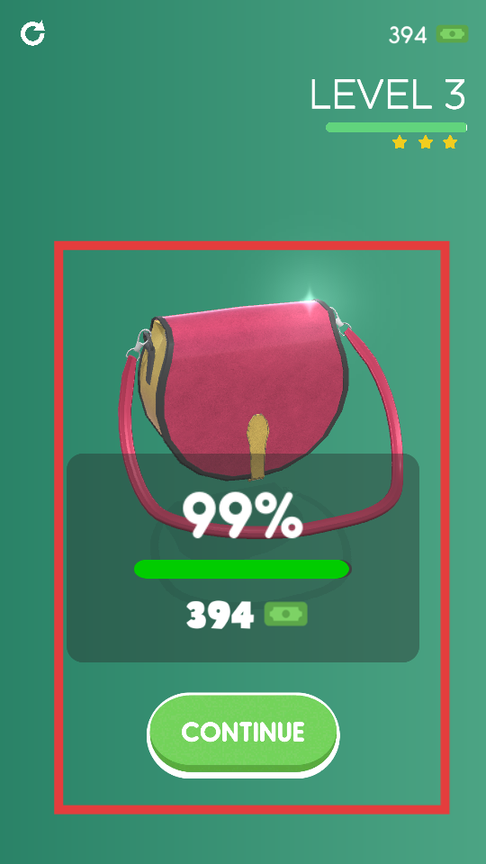 4、完成上色后,界面會顯示物品完成度和獲得的金幣,點(diǎn)擊CONTINUE按鈕,可繼續(xù)進(jìn)行下一個物品的上色挑戰(zhàn)。