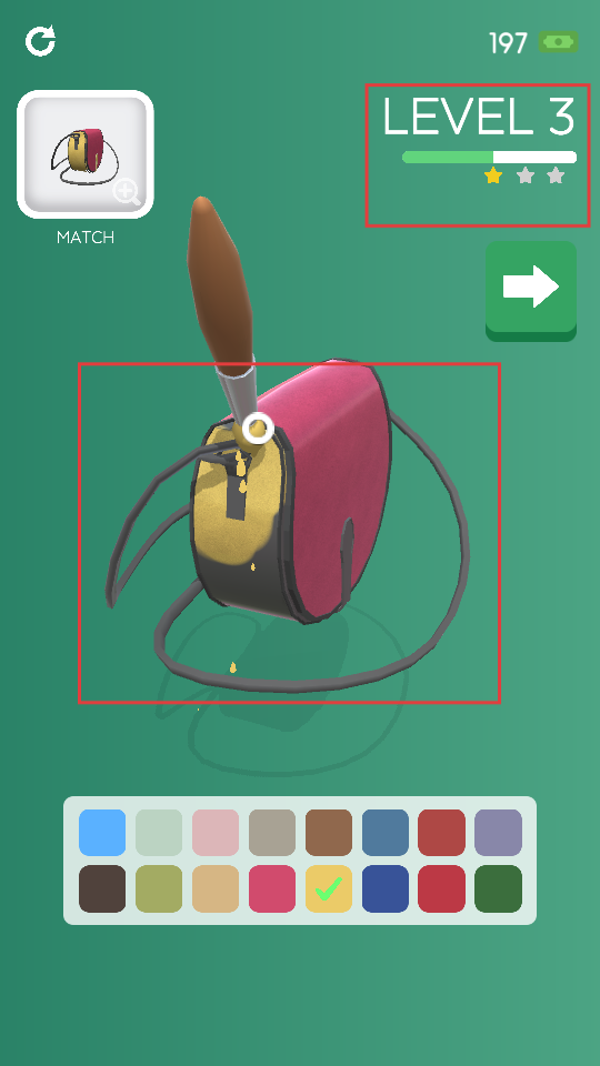 3、不斷調(diào)整所選顏色,仔細(xì)給物品剩余部分上色,當(dāng)進(jìn)度條滿且星星全亮?xí)r,點(diǎn)擊右側(cè)箭頭按鈕,完成當(dāng)前物品的上色任務(wù)。