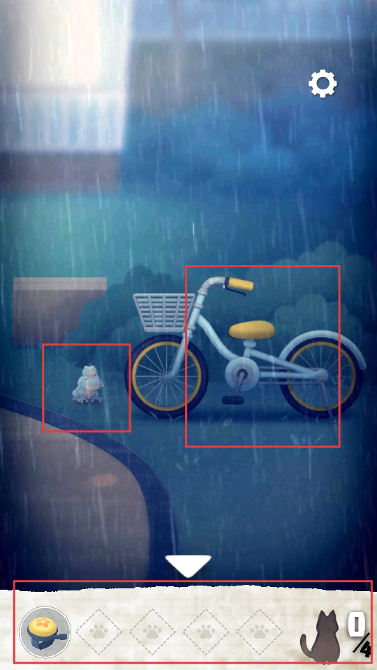 2、在場景中觀察自行車、青蛙等元素,點擊互動,收集道具,下方的爪印和貓咪圖標會記錄收集進度,助力找到貓咪。