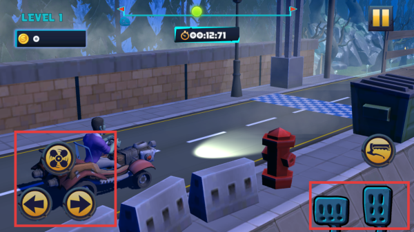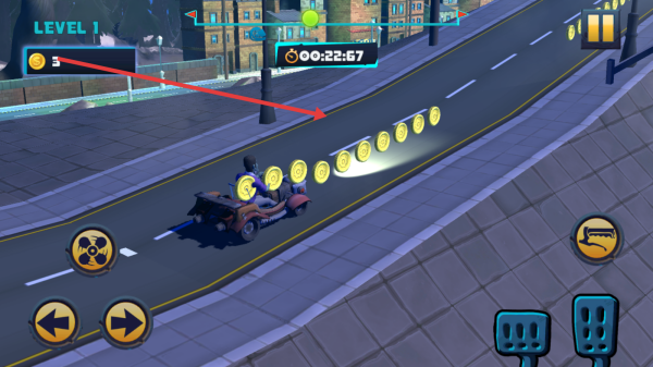2、進(jìn)入游戲關(guān)卡后利用屏幕左下角的方向按鈕控制卡丁車的轉(zhuǎn)向,通過屏幕右下角的加速和剎車按鈕來調(diào)節(jié)卡丁車的速度,保證在賽道上順利行。