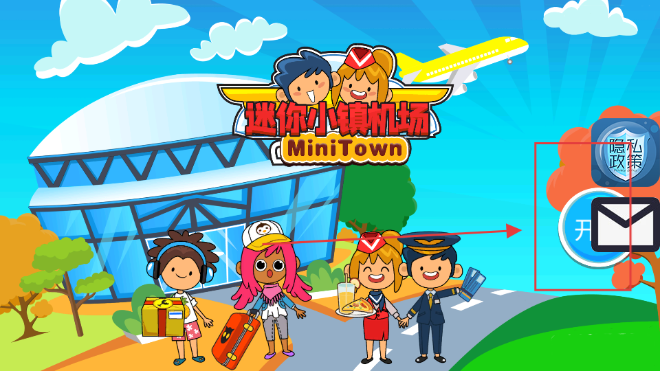 1、進(jìn)入游戲界面,看到迷你小鎮(zhèn)機(jī)場(chǎng)標(biāo)題,點(diǎn)擊右側(cè)開按鈕,即可開啟在機(jī)場(chǎng)的探索之旅,開啟后能看到機(jī)場(chǎng)建筑及相關(guān)角色。