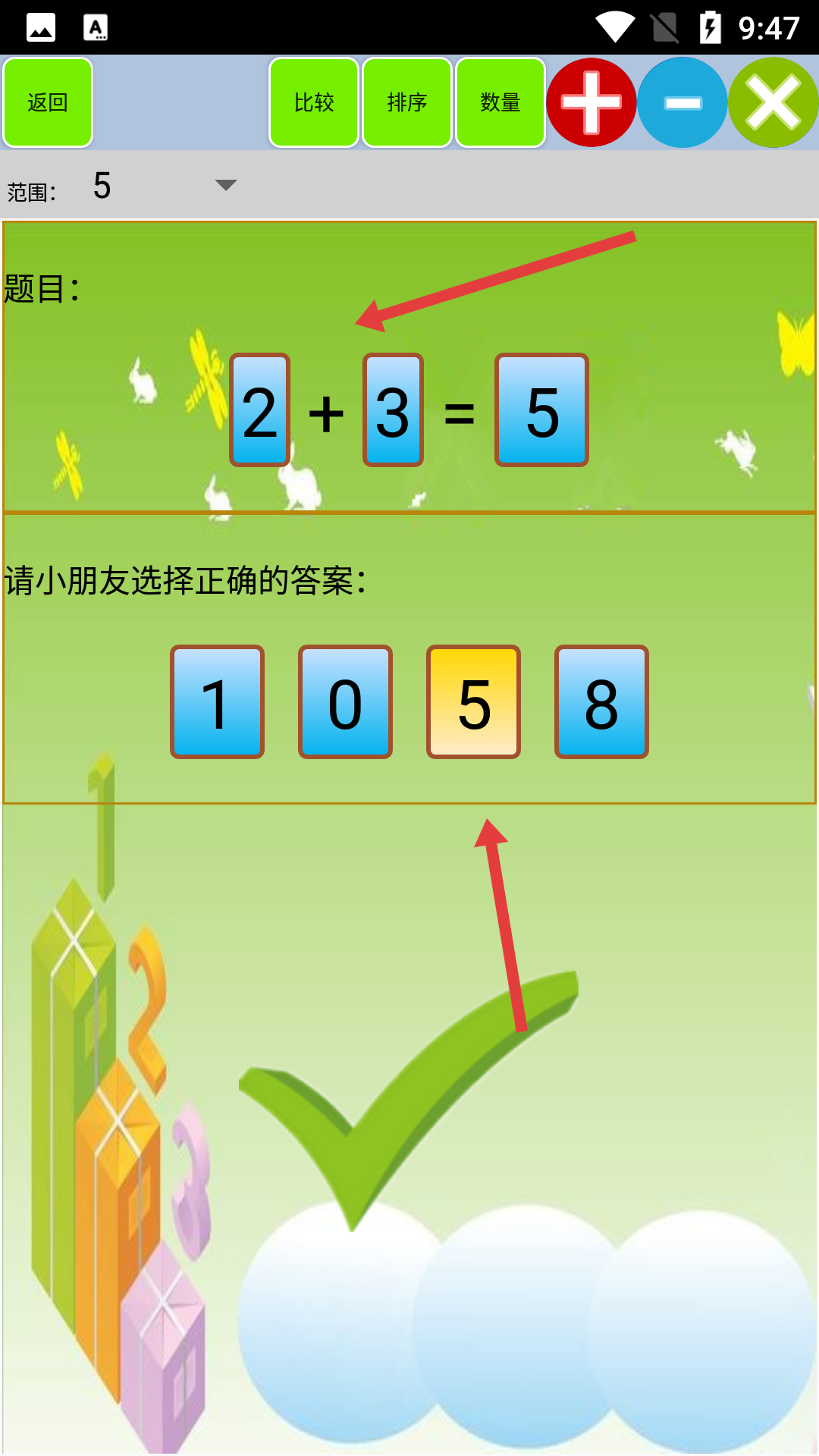 3、朗讀功能由專業(yè)幼教老師配音,支持中英文雙語切換。每個數(shù)字和題目都有清晰發(fā)音,培養(yǎng)孩子的語言能力與數(shù)學(xué)思維同步發(fā)展。