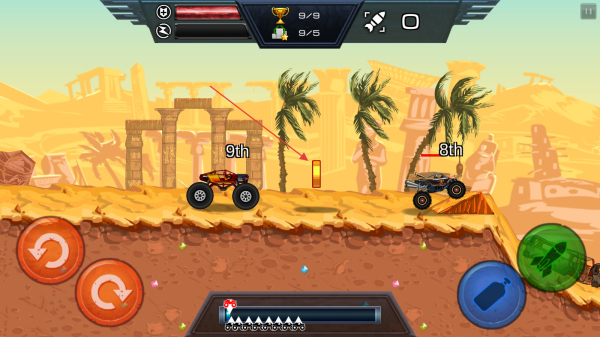 3、玩家注意收集道路上的金幣,在合適時(shí)機(jī)點(diǎn)擊綠色火箭按鈕釋放道具加速超越對(duì)手,讓賽車經(jīng)過賽道上的加速帶,獲取額外的速度提升。