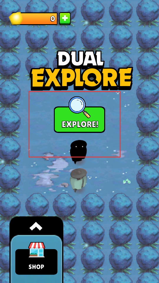 1、點(diǎn)擊綠色EXPLORE按鈕開始探索,畫面中有藍(lán)色植物和一些場(chǎng)景元素,準(zhǔn)備進(jìn)入探索環(huán)節(jié),開啟收集寶石的冒險(xiǎn)。