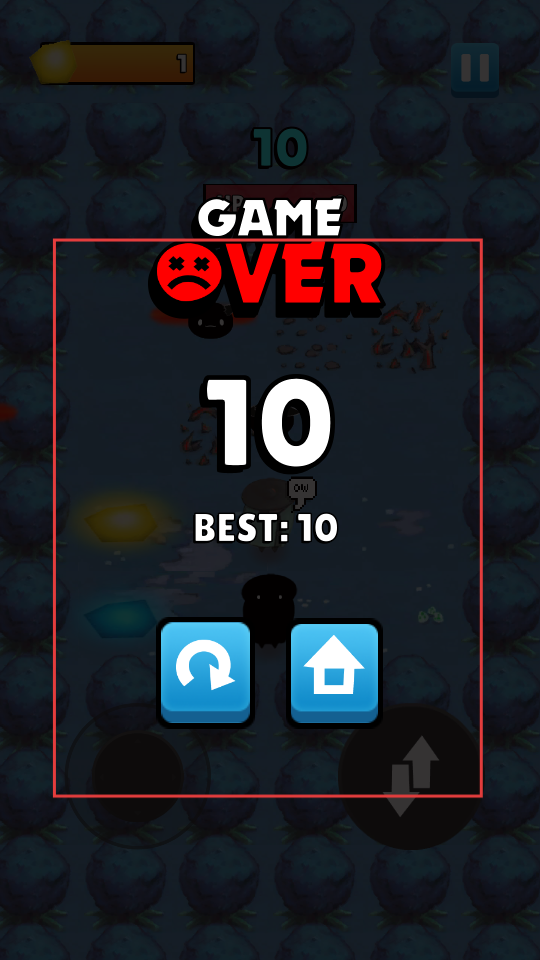 4、當(dāng)探索者HP耗盡,游戲結(jié)束,界面會(huì)顯示GAME OVER和得分,還有BEST分?jǐn)?shù),此時(shí)可點(diǎn)擊重玩按鈕重新開始,或點(diǎn)擊主頁(yè)按鈕返回主界面。