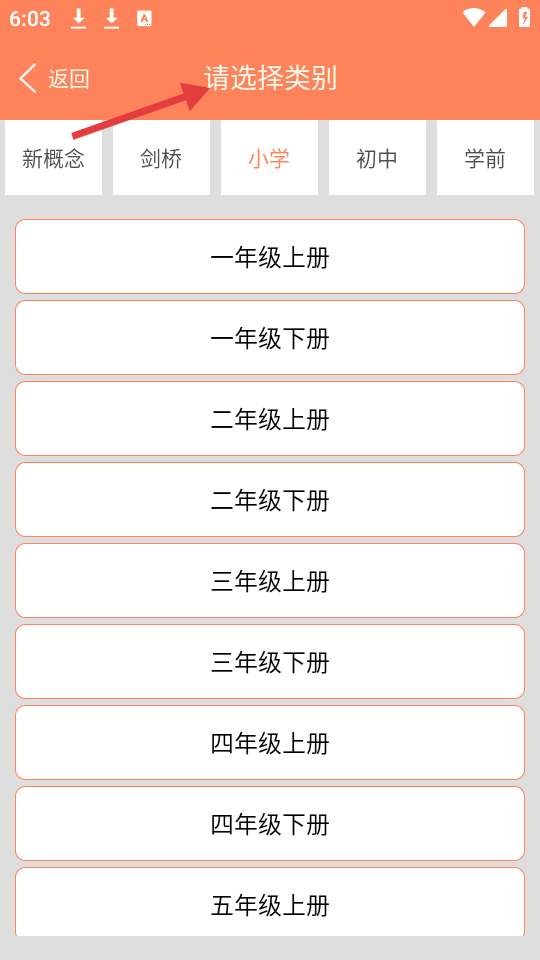 1、首張圖片是英語學習軟件的類別選擇頁,涵蓋新概念、劍橋等,選中小學后,可看到一至五年級上下冊選項。