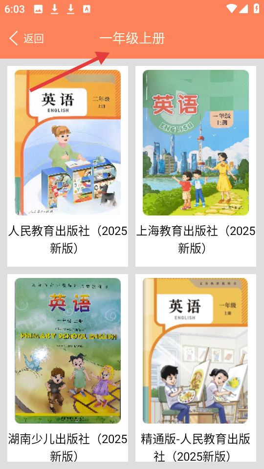 2、中間圖片展示一年級上冊英語課本,有人民教育出版社、上海教育出版社等多家2025新版教材可選。