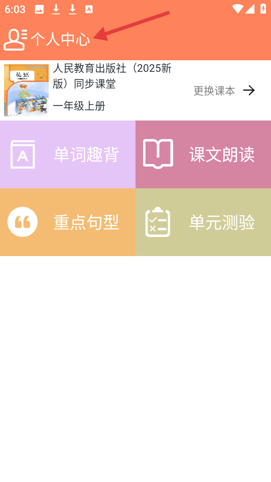 3、末張圖片為個人中心界面,顯示已選的人教社2025新版一年級上冊同步課堂,還有單詞趣背等學習功能。